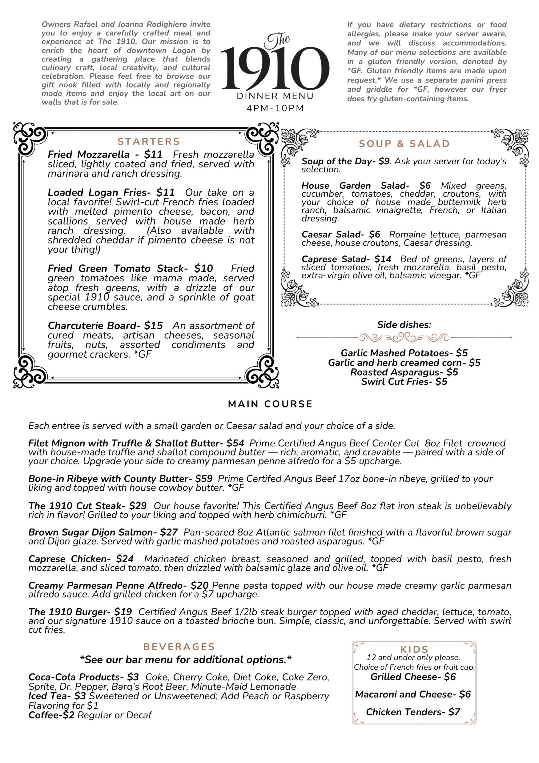 Our dinner menu is ever-changing, designed to highlight seasonal flavors and chef-inspired creations. What you see here is just a sample — each weekend brings something new to the table. Follow us on social media for the latest updates and to see what’s cooking this week.